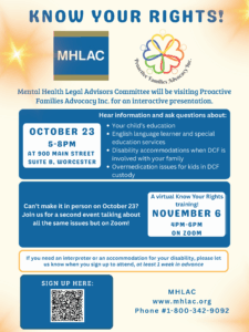 Please join MHLAC and Proactive Families Advocacy Inc for two Know Your Rights training on topics like special education services, disability accommodations, and more!